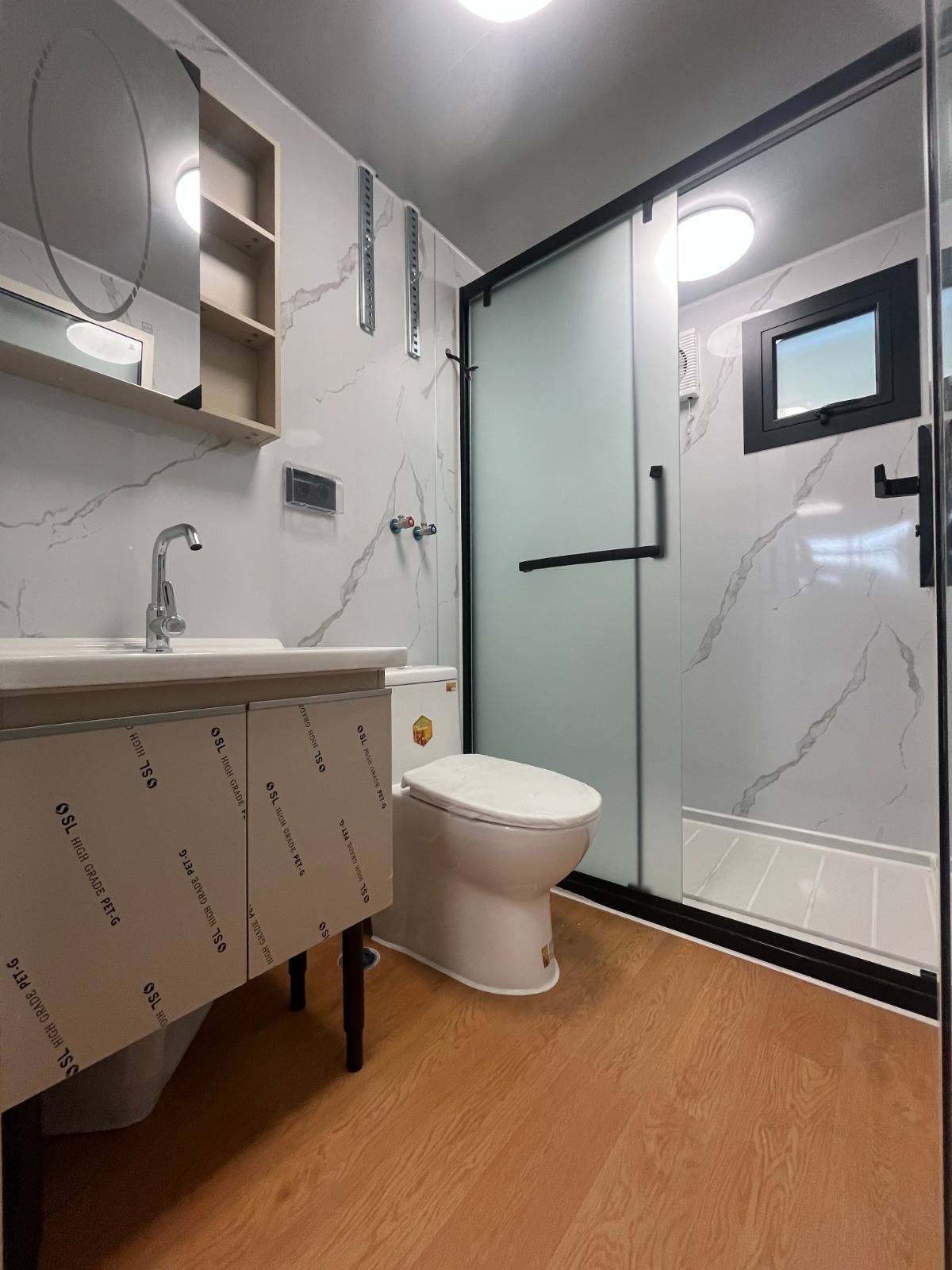 - Badkamer met regendouche, toilet, wastafel en een 50 liter boiler.